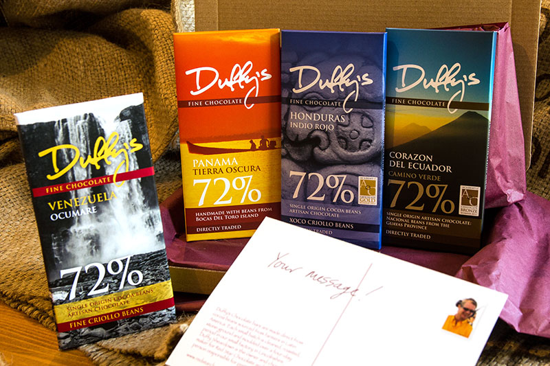 One bar each of the Honduras Indio Rojo 72%, Venezuela Ocumare 72%, Corazon del Ecuador Camino Verde 72% and the Panama Tierra Oscura 72%. All the same strength but with greatly different flavour profiles. Save £1.50 on the cost of bars bought individually. Sent wrapped in tissue with a personalised gift card from you.