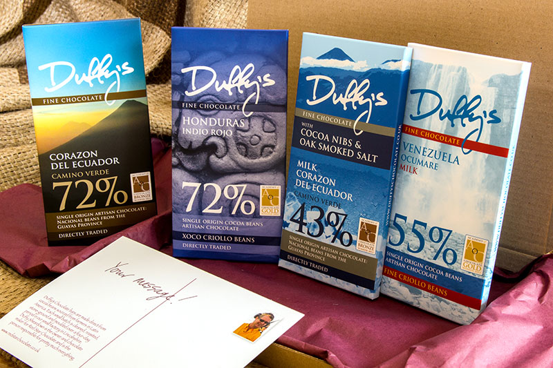 One bar each of Honduras Indio Rojo 72% dark chocolate, Venezuela Ocumare 55% milk chocolate, Corazon del Ecuador Camino Verde 72% dark chocolate and Corazon del Ecuador Camino Verde 43% milk chocolate with oak smoked salt and crushed nibs. All four bars have won awards from the Academy of Chocolate and/or The International Chocolate Awards. Save £1.50 on the cost of the bars bought individually. Sent wrapped in tissue with a personalised gift card from you.